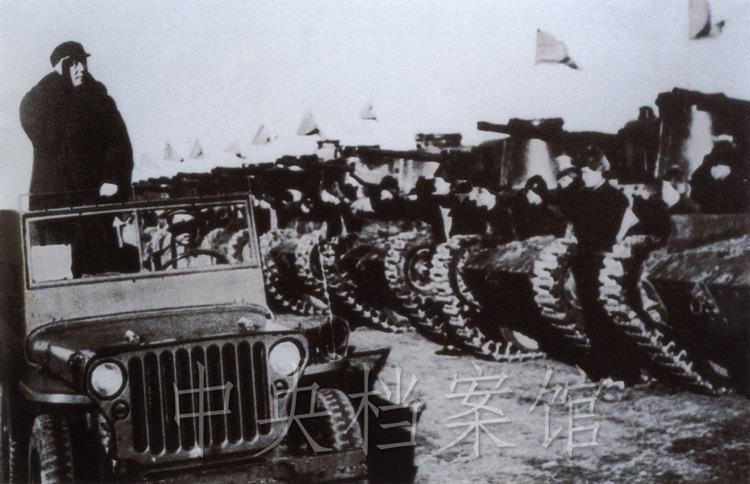 紀(jì)錄片:(群眾呼聲)中國(guó)人民萬(wàn)歲?。o(jì)錄片解說(shuō))檢閱開始了。東北野戰(zhàn)軍參謀長(zhǎng)劉亞樓將軍,向毛主席報(bào)告受檢閱的部隊(duì)全部到齊。坦克塔上飄揚(yáng)著紅旗,坦克手精神百倍,向著自己的領(lǐng)袖敬禮。